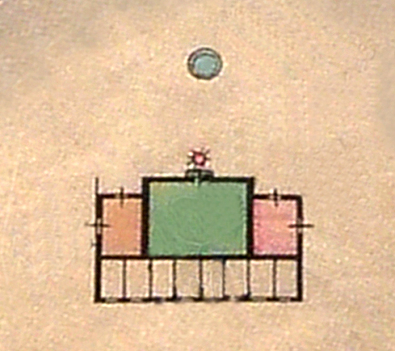 Grundriss des 1864 errichteten Consums des »Consum-Vereins Marienthal« mit den angebauten Holzlagen und dem Brunnen vor dem Eingang. Es befanden sich im Mitteltrakt (grün) ebenerdig das Verkaufslokal und im Halbstock ein Magazin, im jeweils eingeschossigen Nord- und Südtrakt je ein Magazin. Bearbeiteter Ausschnitt aus D[avid] V[alentin] Junk: K[aiserlich] k[önigliche] Baumwoll-Spinnerei, Weberei, Bleiche, Appretur, Färberei und Druckerei Marienthal. 1:500. Wien: Technisches Bureau D.V. Junk 1896. Quelle: Archiv für die Geschichte der Soziologie in Österreich, Virtuelles Archiv Marienthal. |