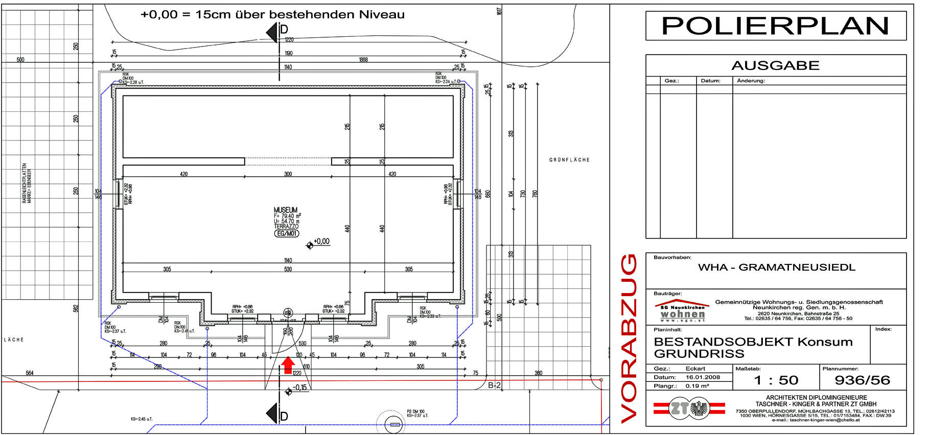 Das Museum Marienthal: Grundriss. Polierplan Bestandsobjekt Konsum. Christine Göschelbauer, Architekturbüro »Architekten Diplomingenieure Taschner-Kinger & Partner ZT GmbH«, für die »Gemeinnützige Wohnungs- und Siedlungsgenossenschaft Neunkirchen reg. Gen.m.b.H.« (SGN). Nordansicht. Plan Nummer 936/56 vom 16. Januar 2008, 30,06 X 65,72 cm. Quelle: Kulturverein Museum Marienthal-Gramatneusiedl. |