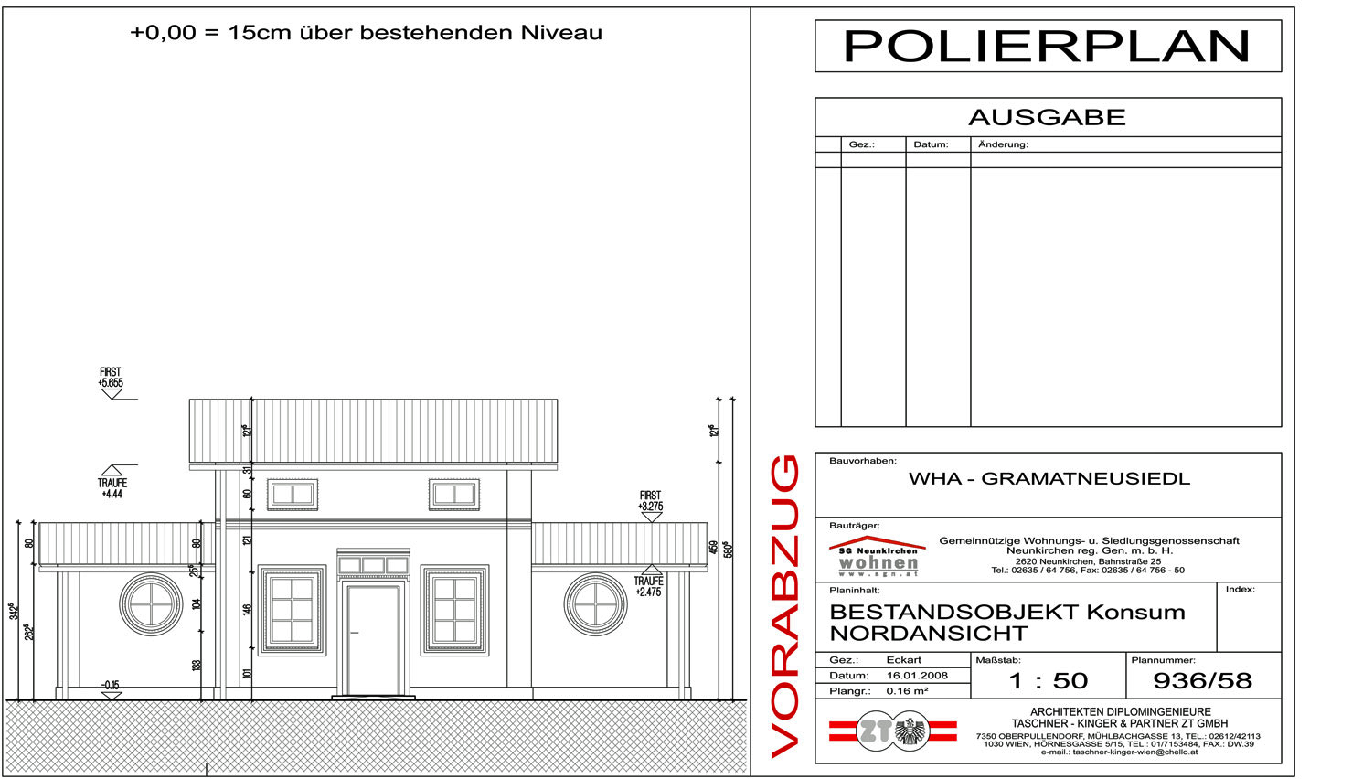 Das Museum Marienthal: Nordansicht. Polierplan Bestandsobjekt Konsum. Christine Göschelbauer, Architekturbüro »Architekten Diplomingenieure Taschner-Kinger & Partner ZT GmbH«, für die »Gemeinnützige Wohnungs- und Siedlungsgenossenschaft Neunkirchen reg. Gen.m.b.H.« (SGN). Nordansicht. Plan Nummer 936/58 vom 16. Januar 2008, 30,06 X 52,60 cm. Quelle: Kulturverein Museum Marienthal-Gramatneusiedl. |