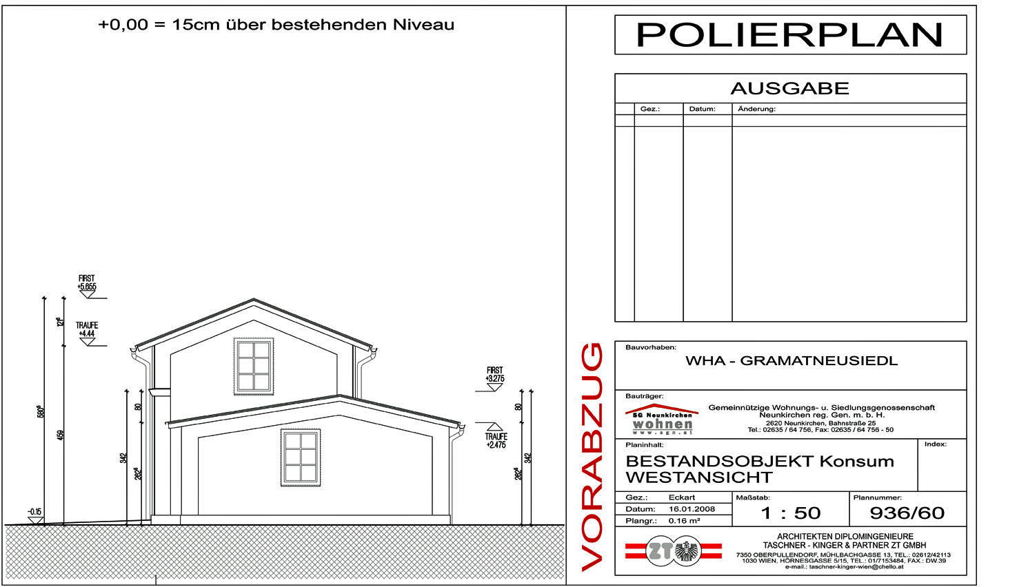 Das Museum Marienthal: Westansicht. Polierplan Bestandsobjekt Konsum. Christine Göschelbauer, Architekturbüro »Architekten Diplomingenieure Taschner-Kinger & Partner ZT GmbH«, für die »Gemeinnützige Wohnungs- und Siedlungsgenossenschaft Neunkirchen reg. Gen.m.b.H.« (SGN). Nordansicht. Plan Nummer 936/60 vom 16. Januar 2008, 30,06 X 52,60 cm. Quelle: Kulturverein Museum Marienthal-Gramatneusiedl. |