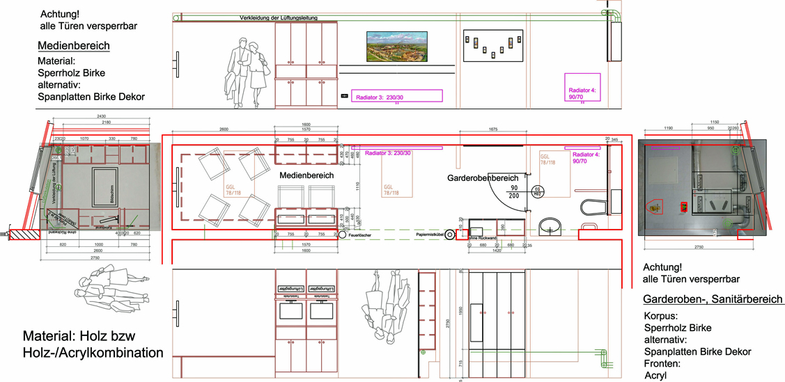 Einrichtungsplan von Erwin Milalkovits und Burkhard Gager für den Medien-, Garderoben- und Sanitärbereich des Museums Marienthal. Erwin Milalkovits und Burkhard Gager: Einrichtungsplan Museum Marienthal, Medien-, Garderoben- und Sanitärbereich. Zeichner: Erwin Milalkovits. Gramatneusiedl, am 19. März 2011, 19,37 X 39,76 cm. Quelle: Kulturverein Museum Marienthal-Gramatneusiedl. |
