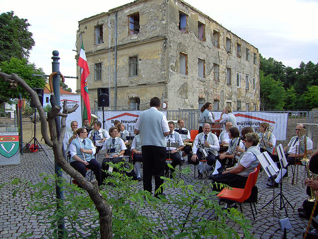 Die musikalische Umrahmung des Festes im Hof des Arbeiterwohnhauses Nusshof vor dem erhalten gebliebenen Trakt des Arbeiterwohnhaus Altgebäude: der Musikverein Gramatneusiedl. Foto von Gerhard Gröss, 27. Juni 2008, 22,58 X 16,93 cm. Quelle: Virtuelles Bildarchiv »Marienthal«, Signatur 47/047.001.179. |