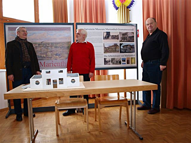 Das Modell des Museums Marienthal, dahinter die Poster für die Veranstaltung. Von links: Burkhard Gager, künstlerischer Gestalter des Museums, Reinhard Müller, wissenschaftlicher Gestalter des Museums und Leiter des Gesamtprojekts, Tibor Schwab, Obmann des »Kulturvereins Museum Marienthal-Gramatneusiedl«. Foto von Norbert Baca, 29. Januar 2011, 22,58 X 16,93 cm. |