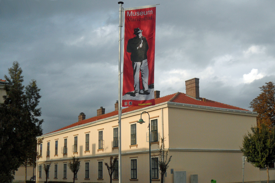 Die Fahne für das Museum Marienthal vor dem Arbeiterwohnhaus Johanneshof, Hauptstraße 49. Foto von Rudolf Andreas Tesar, 15. Oktober 2012, 10,16 X 15,24 cm. Quelle: Mit freundlicher Genehmigung von Rudolf Andreas Tesar, Gramatneusiedl. Copyright © 2012 Rudolf Andreas Tesar, Gramatneusiedl |