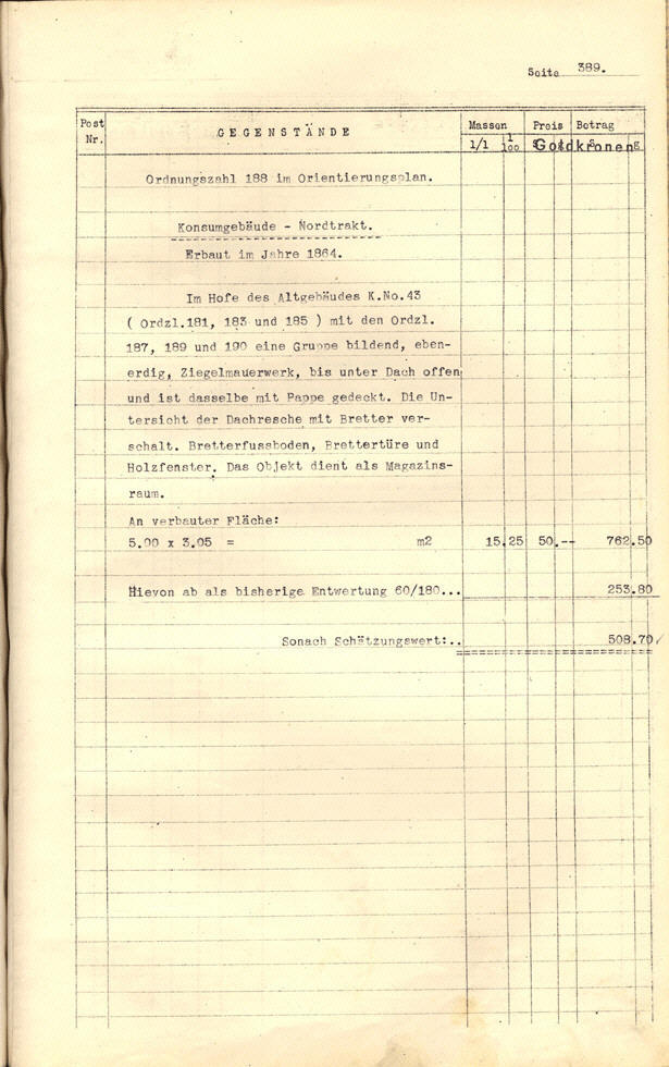 Quelle: Michael Hartmann & Friedrich Honis: Gebäude-Schätzung der Aktien-Gesellschaft der Baumwoll-Spinnereien, Webereien, Bleiche, Appretur, Färberei u[nd] Druckerei zu Trumau–Marienthal. Fabrik Marienthal. [Wien] 1926, S. 389. |