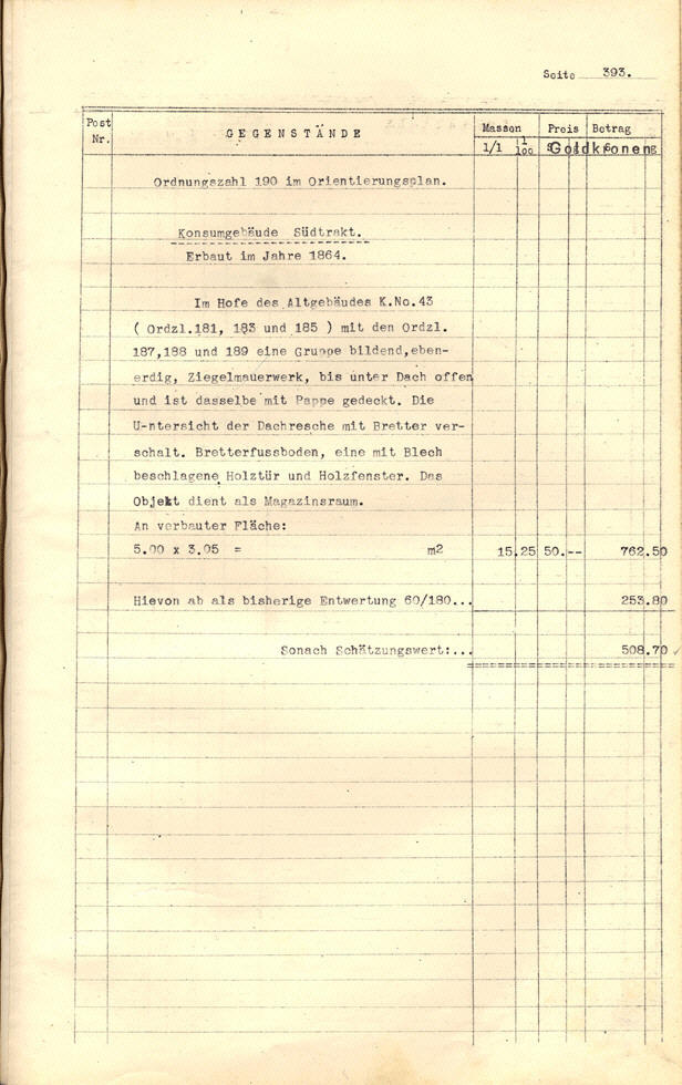 Quelle: Michael Hartmann & Friedrich Honis: Gebäude-Schätzung der Aktien-Gesellschaft der Baumwoll-Spinnereien, Webereien, Bleiche, Appretur, Färberei u[nd] Druckerei zu Trumau–Marienthal. Fabrik Marienthal. [Wien] 1926, S. 393. |