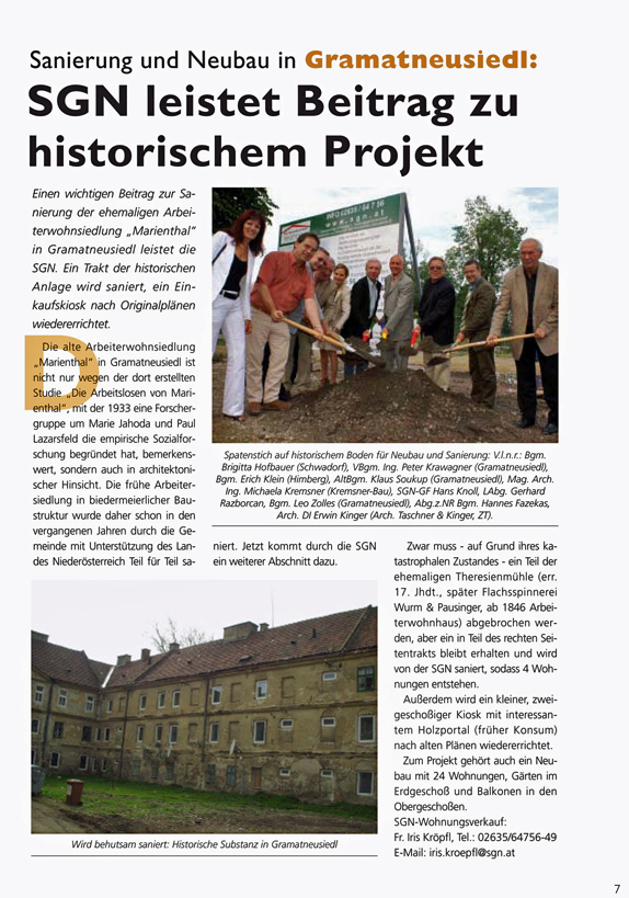 Quelle: [Anonym]: Sanierung und Neubau in Gramatneusiedl: SGN leistet Beitrag zu historischem Projekt, in: SGN wohnen. Das Magazin der Siedlungsgenossenschaft Neunkirchen und der SG Elin (Neunkirchen), [9.] Jg., Nr. 2 ([August] 2008), S. 7.
