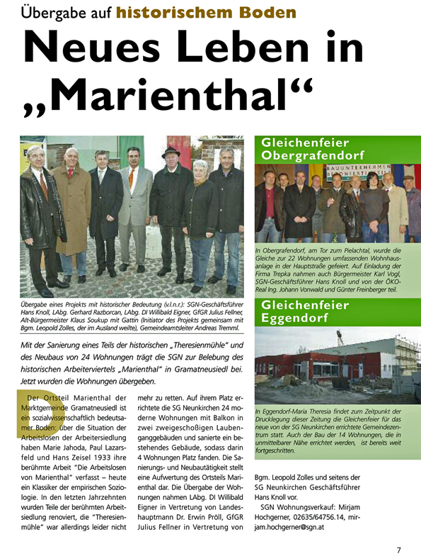 Quelle: [Anonym]: Übergabe auf historischem Boden. Neues Leben in »Marienthal«, in: SGN wohnen. Das Magazin der Siedlungsgenossenschaft Neunkirchen und der SG. Elin (Neunkirchen), [10.] Jg., Nr. 3 ([Dezember] 2009), S. 7.
