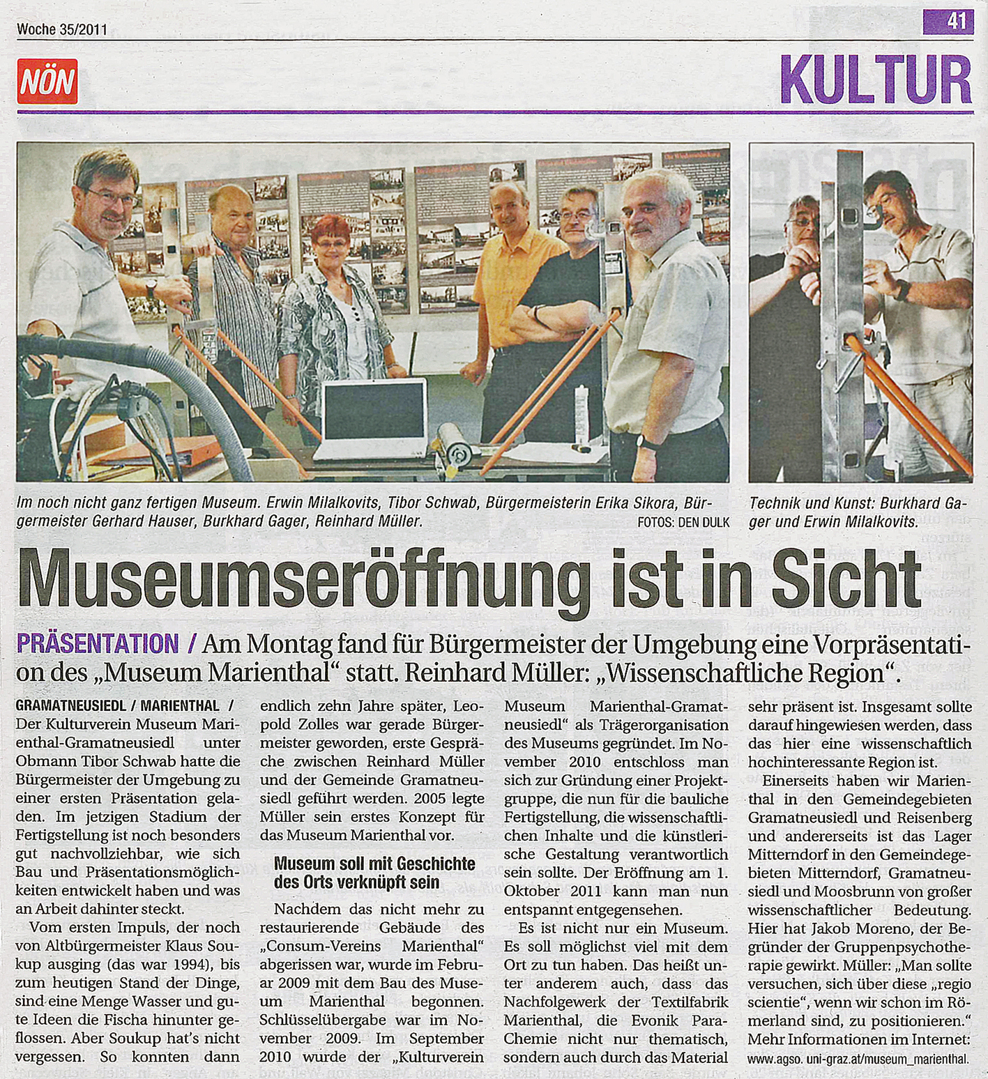 Quelle: [Jopie Den Dulk]: Museumseröffnung ist in Sicht. Präsentation. Am Montag fand für Bürgermeister der Umgebung eine Vorpräsentation des »Museum Marienthal« statt. Reinhard Müller: »Wissenschaftliche Region«, in: NÖN. Niederösterreichische Nachrichten. Unabhängige Wochenzeitung für Niederösterreich. Bezirksausgabe Schwechat (St. Pölten), 35. Woche / 2011 ([31]. August 2011), S. 41 |